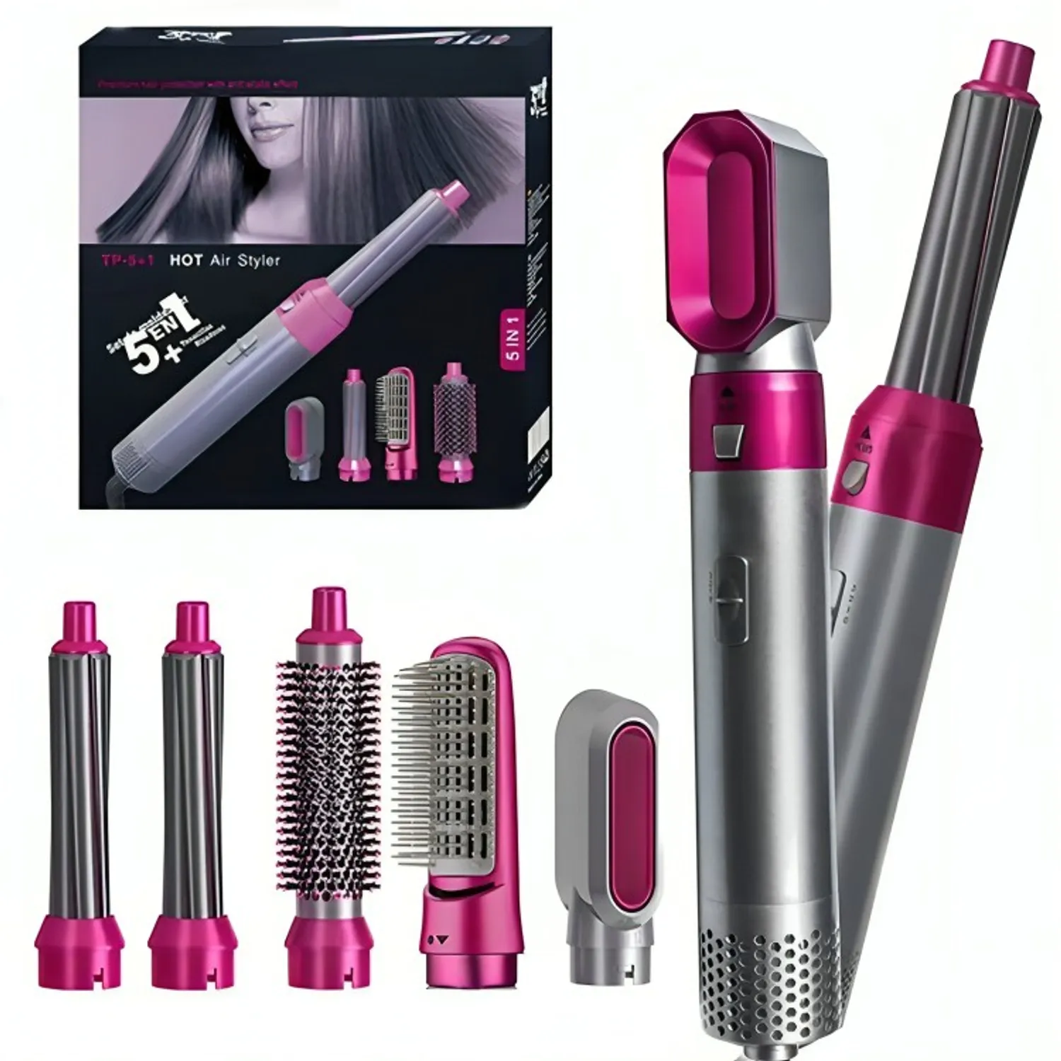 Plancha por un lado, secador por otro y rizadores por todas partes… ¡un caos total en tu rutina! Con el Cepillo Secador 5 en 1, tienes en un solo dispositivo secador, rizador, plancha, peine y moldeador de aire caliente, ahorrando tiempo, dinero y espacio en tu tocador.